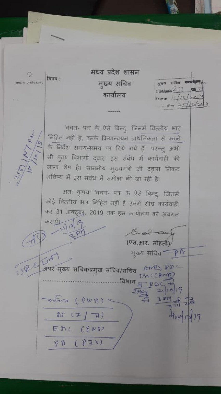 जिसमें मुख्यसचिव एस.आर. मोहंती द्वारा विभागों को लिखा जाना उल्लेखित किया गया हैं कि बचन पत्र के उन बिंदुओं के क्रियान्वयन के लिए कार्यबाही करें जिनमें शासन पर वित्तीय भार नहीं पड़ रहा है। इस संबंध में बचन पत्र के उन बिंदुओं के क्रियान्वयन करने के लिए समय समय पर निर्देश दिए गए हैं। इनकी समीक्षा मुख्यमंत्री कमलनाथ द्वारा शीघ्र की जाएगी।